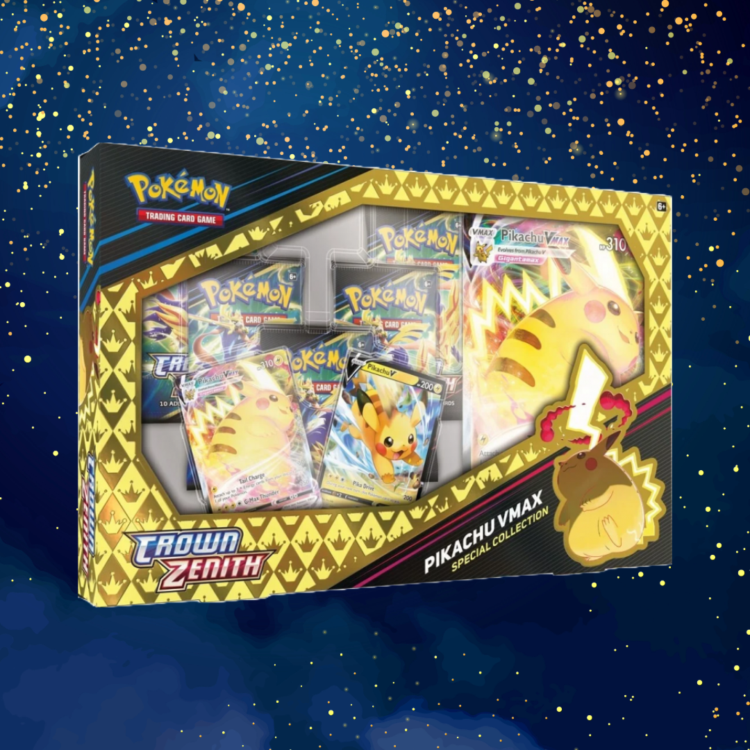 Diese Special Collection aus der beliebten Crown Zenith-Serie enthält eine exklusive Pikachu VMAX Promokarte sowie eine Pikachu V-Karte – beide in atemberaubender Optik. Mit 5 Crown Zenith Boosterpacks bekommst du alles, was dein Sammlerherz höher schlagen lässt.